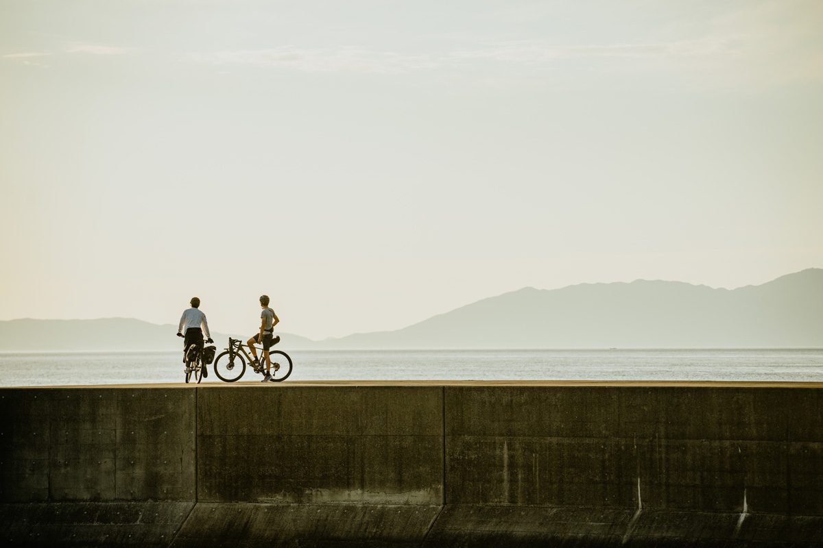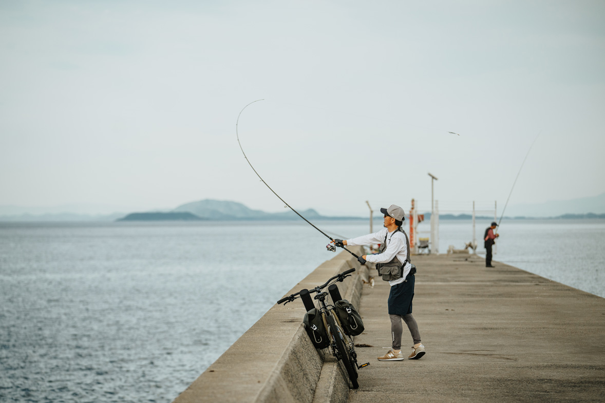 前日に工場を案内してくれた坂本さんとこの崎津で再び合流した。クルマでも熊本市内から2時間以上かかるから、「本当に自転車で釣りをしに来たんですね」と少々驚いているようす。ルアーを投げるその動作のむだのなさは、「釣りウマ」のそれだ。
