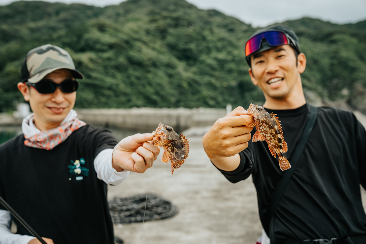 ……するとたちまちにヒット! 釣れてきたのは、小ぶりなカサゴだったが、はるばるやってきた天草での一尾、大きさに関係なく嬉しい。同時に坂本さんにも釣れてダブルヒットだった。