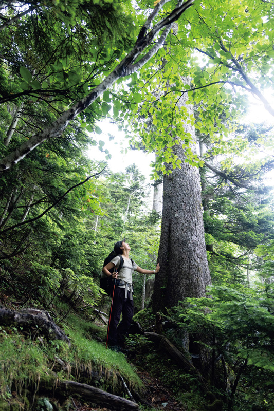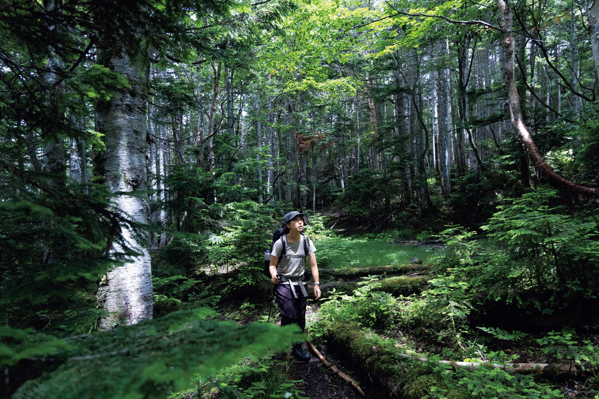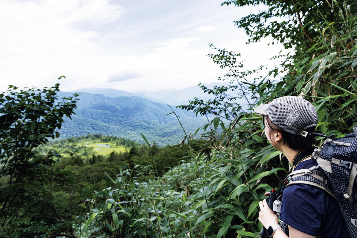 翌朝はいきなり登りでじわりと汗をかく。あちぃ〜と叫んでいたら小淵沢田代が迎えた。黄緑の草原を、ミストを含んだ風が走る。きもちぃ〜。ダケカンバやシダが茂るしっとりした森を進む。プチ藪漕ぎや倒木をまたぐ場面もあり、大変だ、と声を上げつつもアスレチックのようで心が躍る。