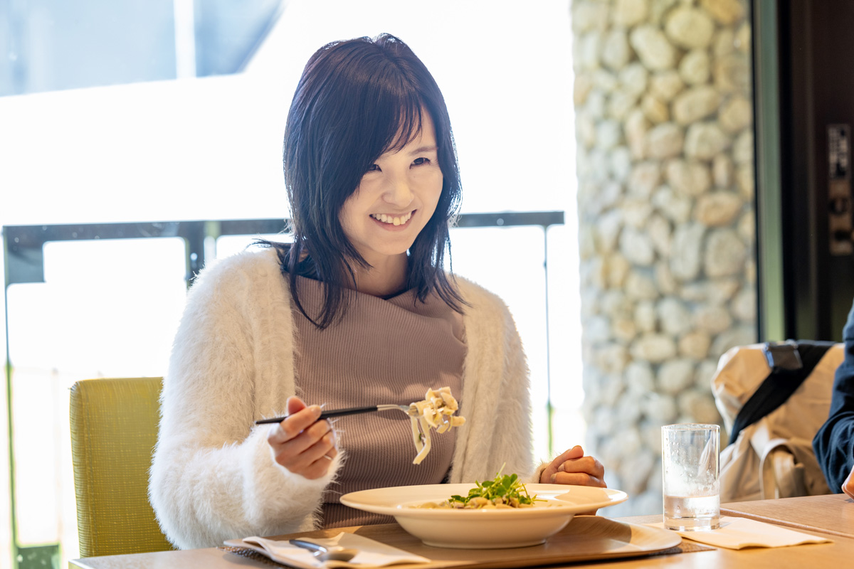 <ANAホリデイ・インリゾート信濃大町くろよん>のもうひとつの楽しみは、地元食材を使ったレストラン。オープンキッチンを眺められる店内は全面ガラス張り。敷地内にあるゴルフ場と北アルプスを見渡せる180°オープンビューで、ゆったりとした食事を。