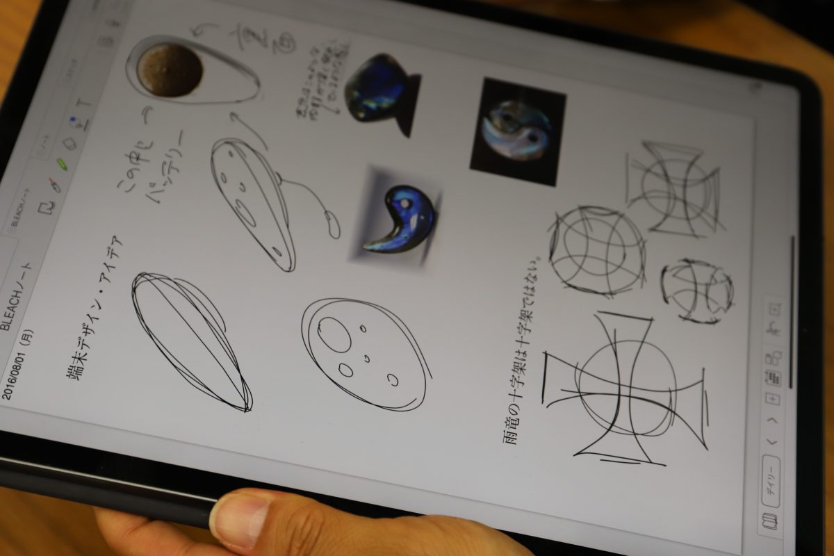 上の写真は、BLEACHの端末デザインアイデア。写真を取り込んだり、絵を描いたり、自在な表現が可能なiPadならではの表現力が活用されている。