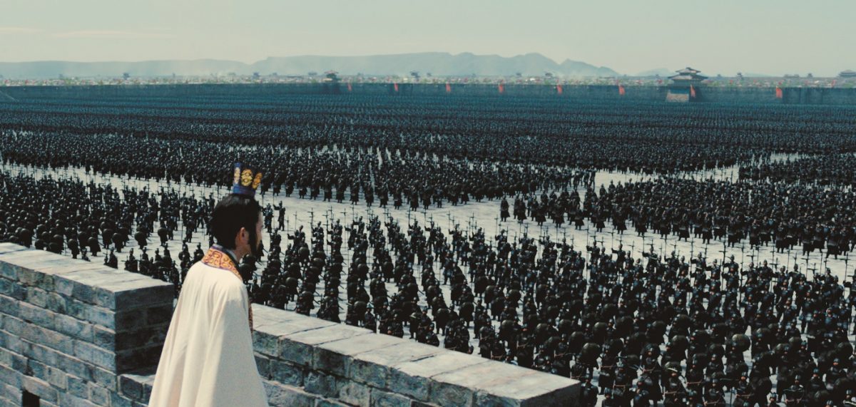実際に撮影が行われた中国浙江省の象山影視城場所とはこういう場所だが、映画の中では……成蟜(せいきょう)が謁見する城壁の下に大軍勢が居並ぶ、下の写真のような光景になるわけだ。