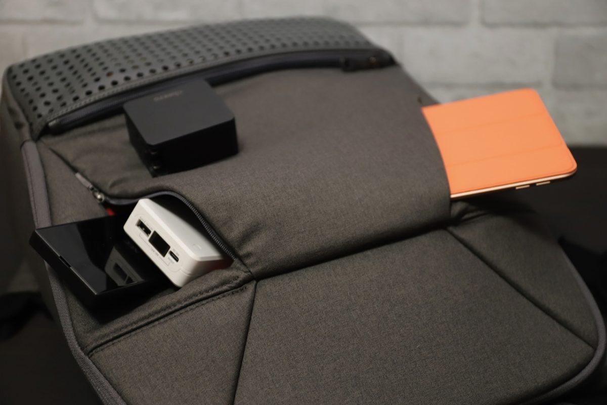 意外と容量はあって、iPad mini、モバイルバッテリー、Wi-Fiルーター、アダプター……ぐらいまではスッポリと入る。