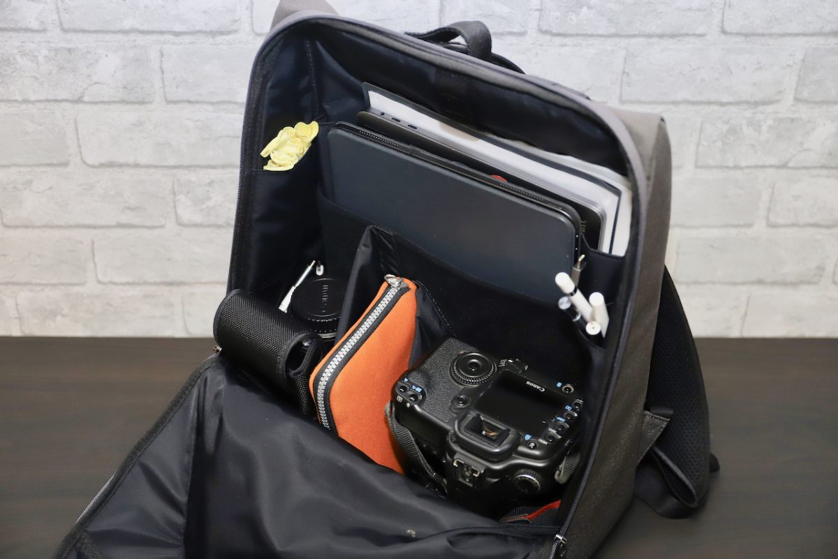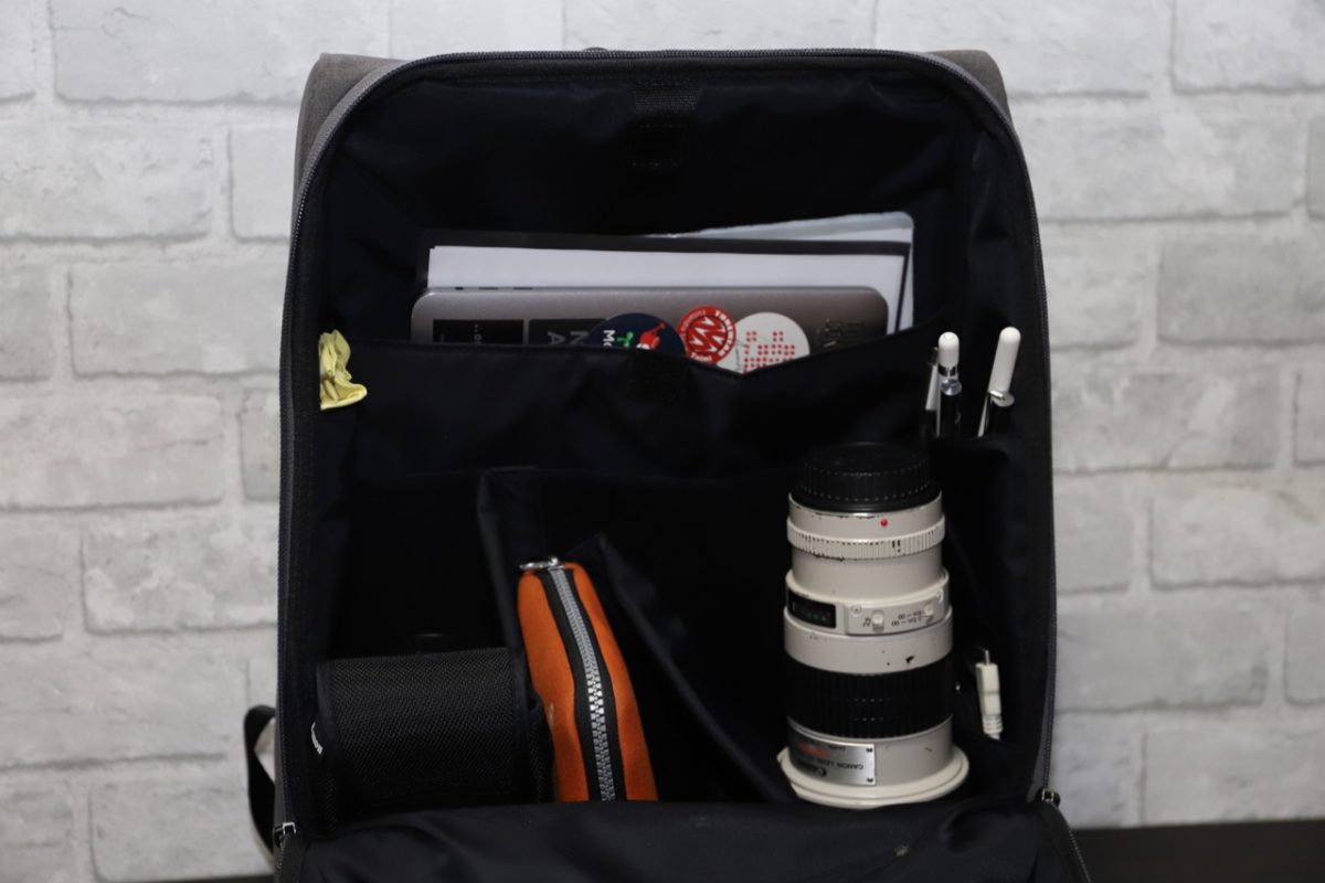 ひらくPCバッグminiに日常的な荷物を入れつつ、取材のためのカメラ機材を別のバッグに入れていた私としては、それがひとつのバッグに入り、楽に背負えるようになったのは非常に素晴らしい! 『ひらくPCリュック』は私にとって、ついにたどり着いた理想の取材バッグかもしれない。