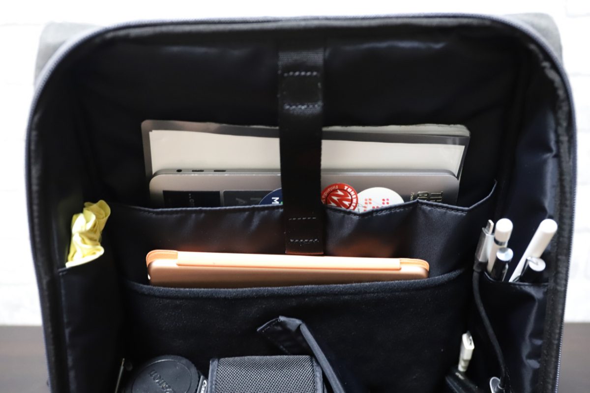 PCコンパートメントにはご覧のように13インチのMacBook Proが楽々。15インチでも楽々入る。噂されているMacBook Proの16インチが発売されても問題なく入るだろうと思える余裕がある。左右のペン立て的ポケットは2段になっており、上の方の段の使い勝手が良さそうだ。