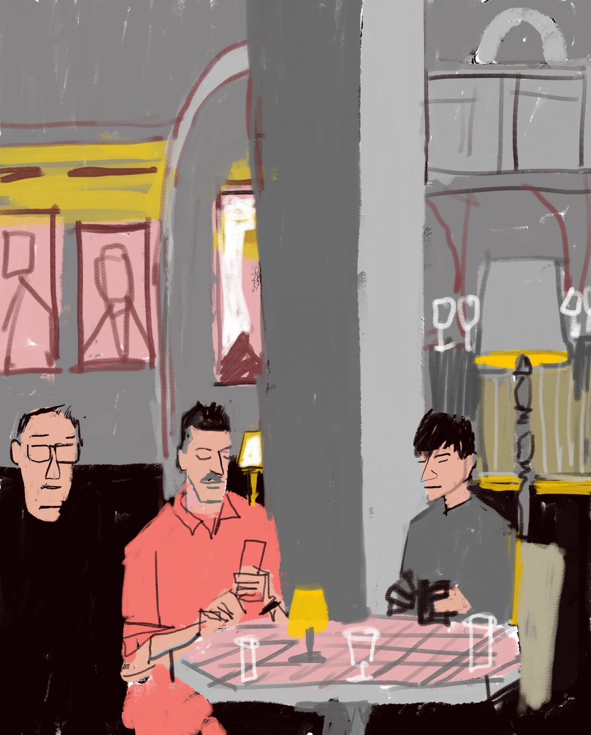 そういえば、ホテルのバーで一杯やってる時には我々のことをスケッチして下さいました。真ん中は私ですが、左右は誰か分かりますか? 某メディアの編集長さんと、著名ライターさんです。