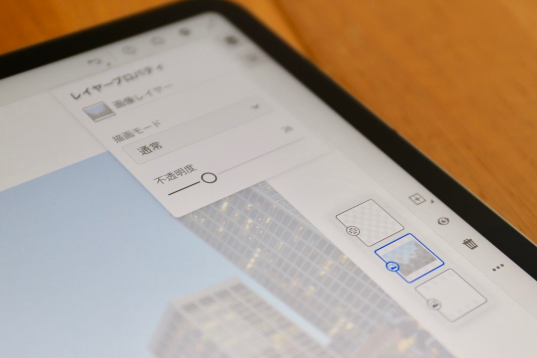 まず、写真を下のレイヤーに敷き、透明度を上げて薄くする。