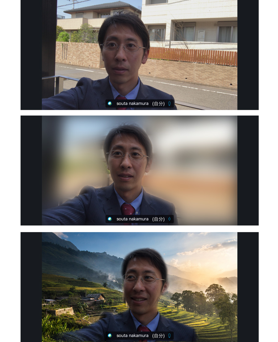 「オンライン会議するとき、背景が気になることって多いですよね。でも、ボタン操作でカンタンに背景をぼかせるんですよ。あと、おしゃれな部屋風とか、大自然のなかからこんにちわ!とか(笑)。誰かが突然変えてきて「なにそれ!」みたいなやりとりも、アイスブレイクにちょうどよかったりしますよね」
