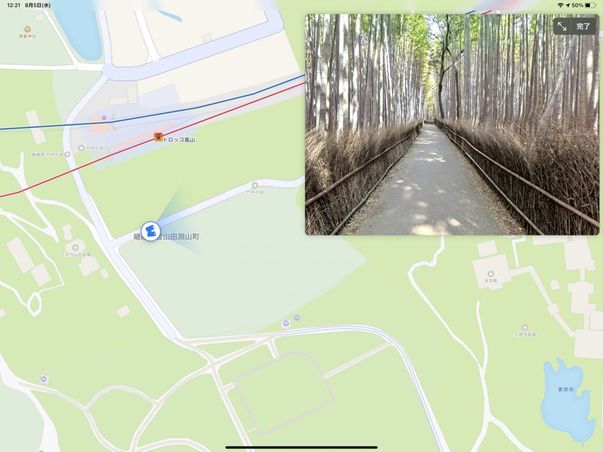 車道のみならず、観光で歩くような歩道もルックラウンドできる。あの嵐山の竹林などもオンラインで散策できるのだ。Googleのストリートビューと違って、アップルのルックアラウンドは非常にスムーズな移動が可能で、景色も詳細に見られるので面白い。