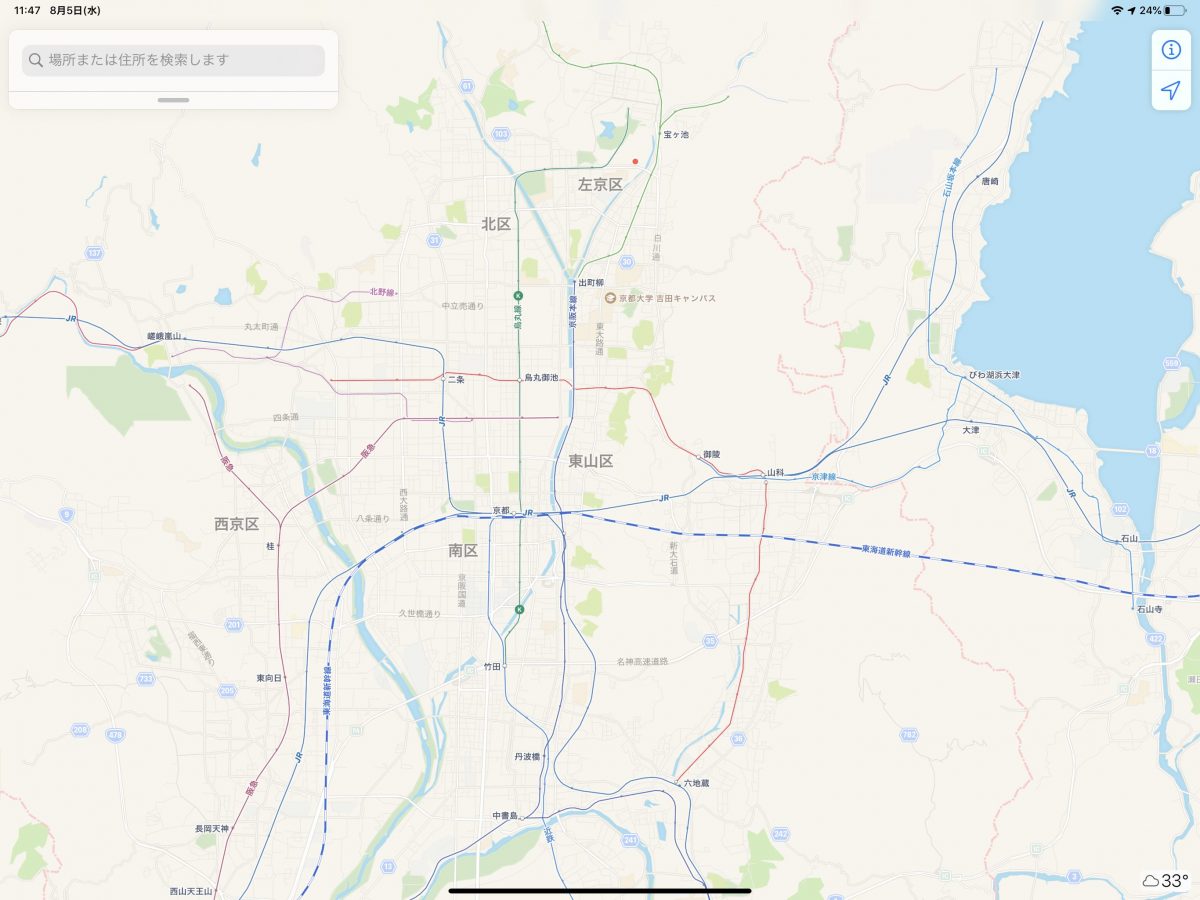 また、御所においてもそうだが、京都全体を見渡してみても、緑のある部分が緑で表示されるようになったので、散策して楽しい日本の緑地部分が分かりやすくなった。