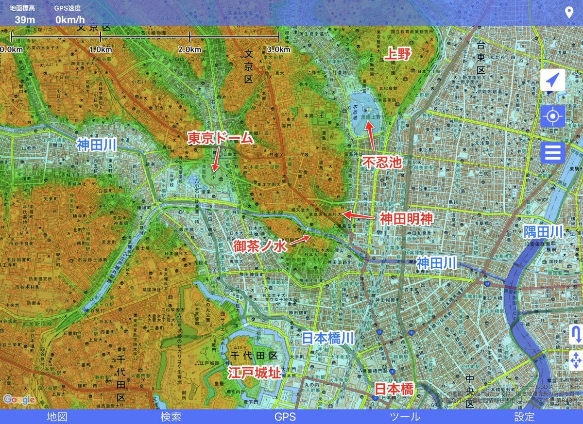 で、この地図+地形図を見ると明らかに一箇所「地形的におかしい」ところがわかるはずだ。お茶の水周辺である。