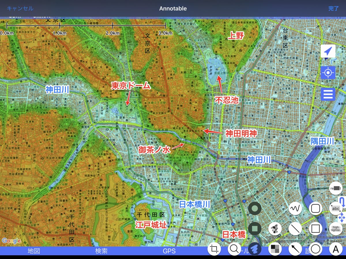 例によって『スーパー地形』アプリの画像。標高差がわかりやすいようオリジナルのパレットで色づけをし、地図への注釈はスクリーンショットを撮った後にiPad版の『Annotable』という注釈アプリで行っている。このアプリ、初期の頃から使ってるけどものすごくよいのだ。パソコン版も作って欲しいくらい。iOS標準のマークアップ機能も味があっていいけど、機能的には『Annotable』が圧勝だ。ツールも多くてシンプルで使いやすい。