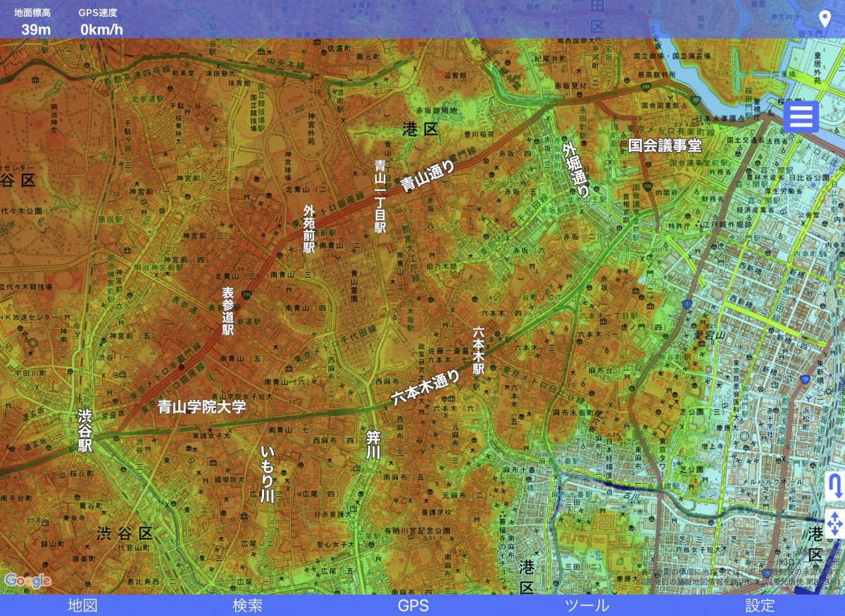 確かに体感したとおり、青山通りの方が起伏が少なく、六本木通りは高低差が激しい。