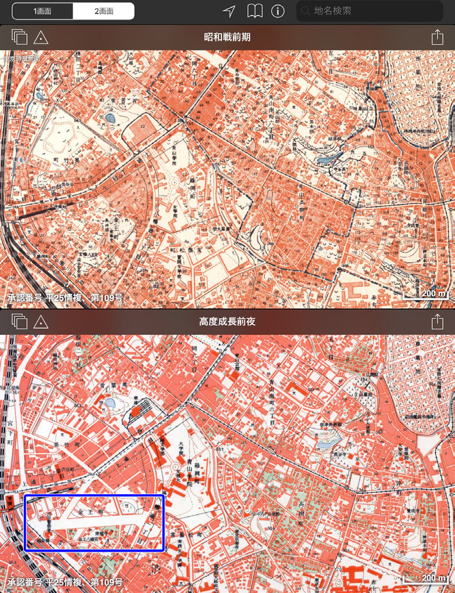 『東京時層地図』で戦前と戦後(昭和30年代前半)の地図を並べて見ると、戦前は六本木通りの影も形もないのに、昭和30年代に入ると渋谷駅から東へ工事が始まっているのがわかる。