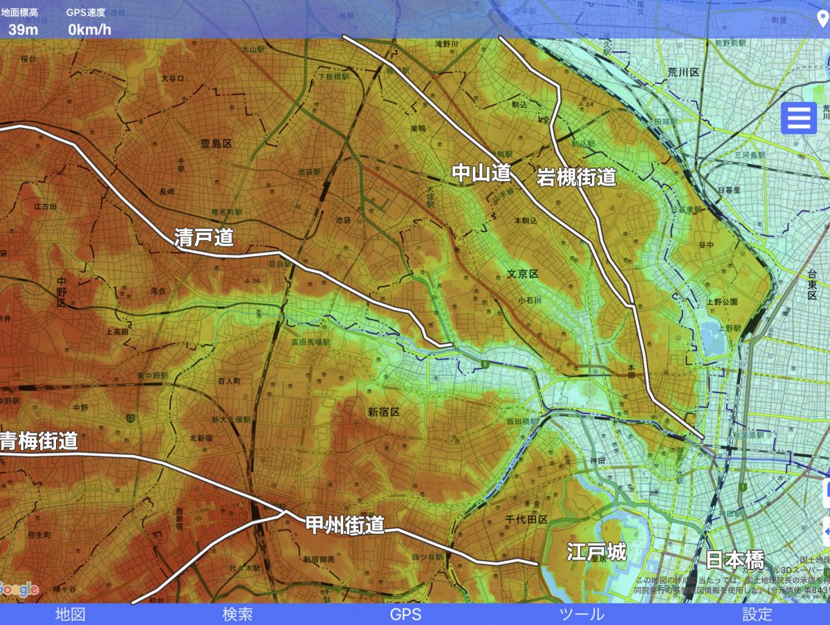 東京の地形は江戸城を中心に放射状に街道を作りやすい地形になってて、甲州街道も中山道もきれいに台地上を抜けているのだ。微妙に谷を避けつつ。