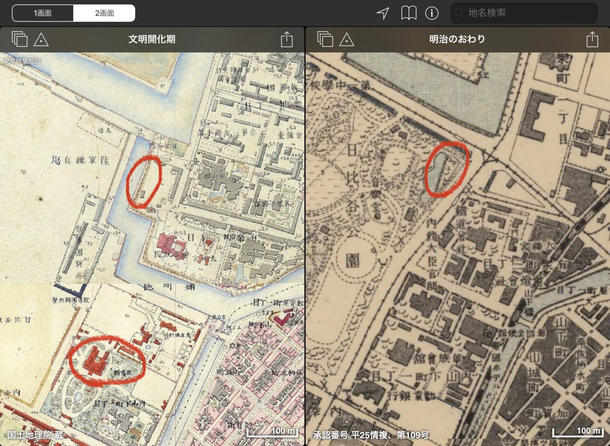 これだけだとわかりづらいので『東京時層地図 for iPad』も参照してみたい。