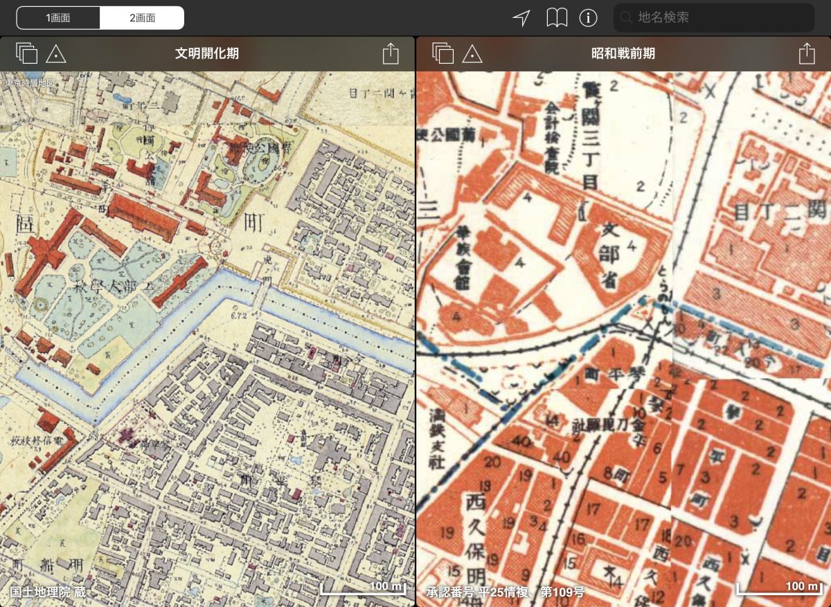 というわけでまずは地図アプリ。『東京時層地図 for iPad』(日本地図センター)を開いて見る。