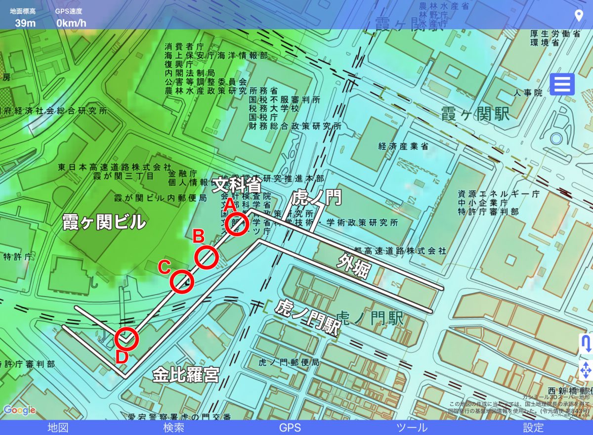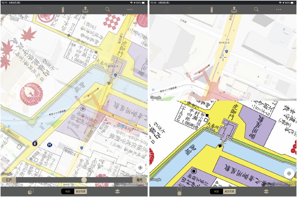 ちょいと江戸時代の様子と比べてみたい。とりだしたるは『大江戸今昔めぐり』という地図アプリ。
