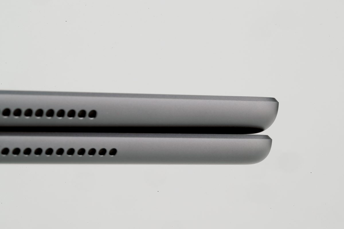 ベゼルはAirより少し太い。ディスプレイは細かいところで差をつけられており、ProMotionも、P3も、フルラミネーションも装備されていない。