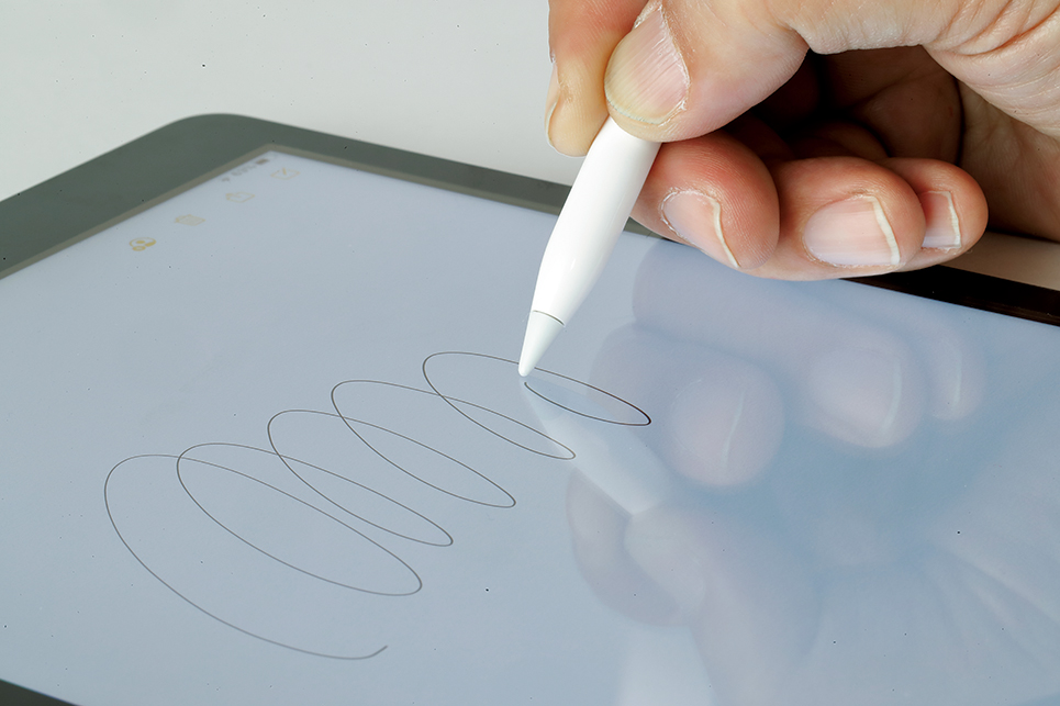 ペンシルで素早く描く。見た目にほとんど差はないが、追従速度に違いはある。また、ペンシルの先から描画までわずかにガラスの厚さがある。