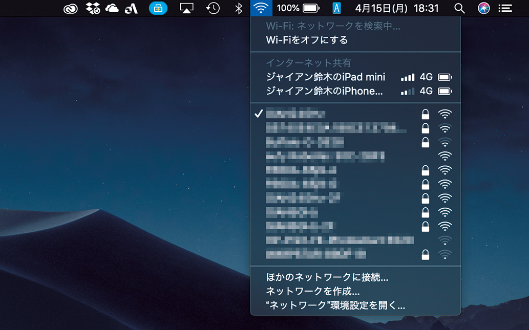 iPhone の『インターネット共有』を有効にしておけば、MacBookのWi-Fiアイコンから選択するだけで利用開始できる。