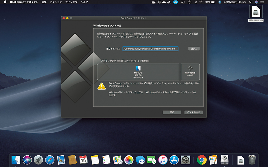 macOS に標準でインストールされている『Boot Campアシスタント』を使うと、ストレージにWindows 用の領域(パーティション)を作りインストールできる。