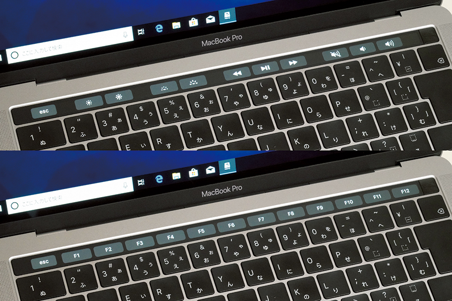 Windows環境ではMacBook Proの『Touch Bar』は機能キー、ファンクションキーとして機能する。ただしmacOS 環境のように高度な機能は利用できない。