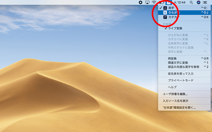 右上のメニューバーでも入力ソースの変更が可能。3つ以上の言語を使う時は、ここからそれぞれに切り替える。