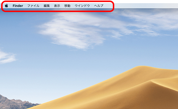 リンゴのカタチをしたAppleメニュー内の項目はシステム環境設定やシステム終了など常に同じ。しかし『ファイル』などの項目は、機能が異なるアプリごとに違う。