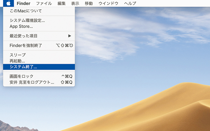 基本的に電源は左上のAppleメニューで『システム終了』を選んで電源を切る。スリープも同様の操作で行える。