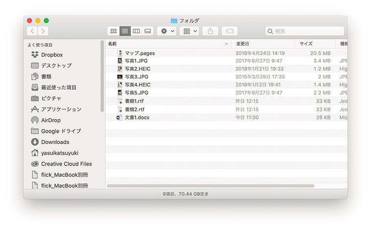 Finderには『アイコン』『リスト』『カラム』『Cover Flow』 の表示方式がある。一覧表示したいのなら『リスト』 や 『カラム』 を、開かなくてもファイルの中身を確認したいのなら『アイコン』 などが便利だ。