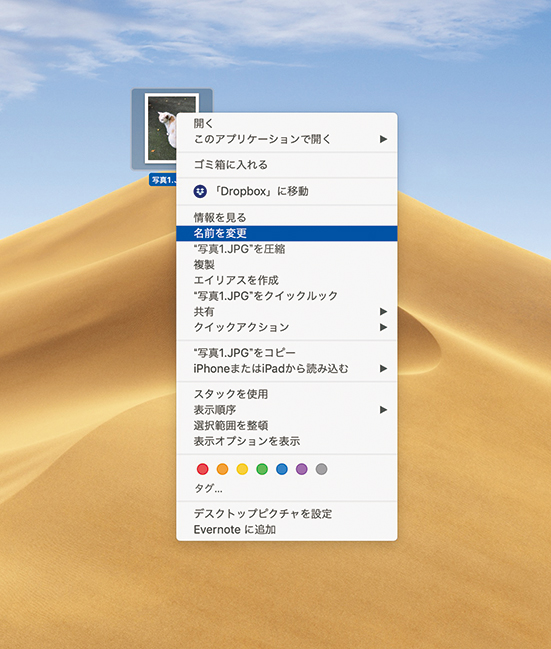 選択してoptionを押してクリック、もしくはマウスで右クリック、トラックパッドの場合は2本指でクリック、すればコンテキストメニューが開く。ファイルの名称変更も可能。