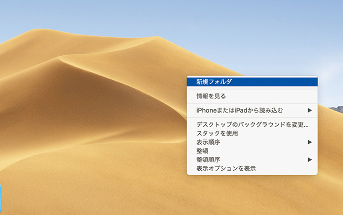 何も選択せずにコンテキストメニューを開くことで、新規フォルダの作成やデスクトップに関する操作を行えるようになる。
