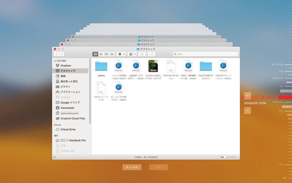 保存時期ごとにウィンドウが重なって表示。古いバックアップは適宜、削除され、さまざま時期のバックアップが自動で残る。