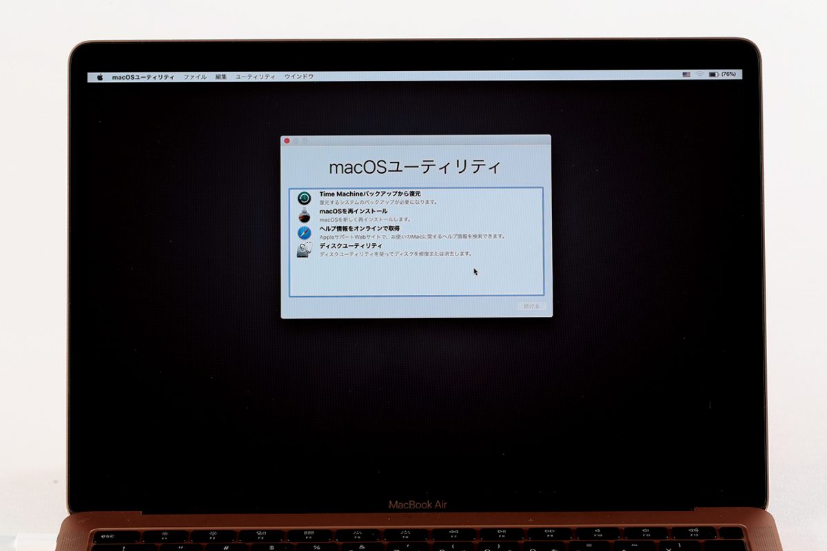 Macには『macOS復元』という特別なプログラムが用意されている。一度、電源をオフにして、再度オンに。その直後にApple ロゴなどが出るまでcommand+Rを、押し続けて起動する。