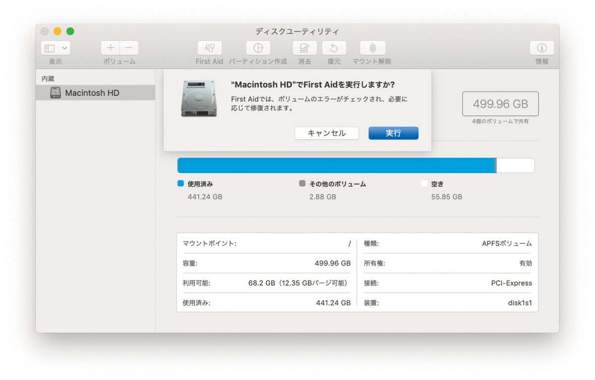 『ディスクユーティリティ』の『FirstAid』はMac 内のエラーを確認し、必要に応じて修復してくれる。純正のメンテナンス機能なので安心して使える。『macOS 復元』で行うこともできる。