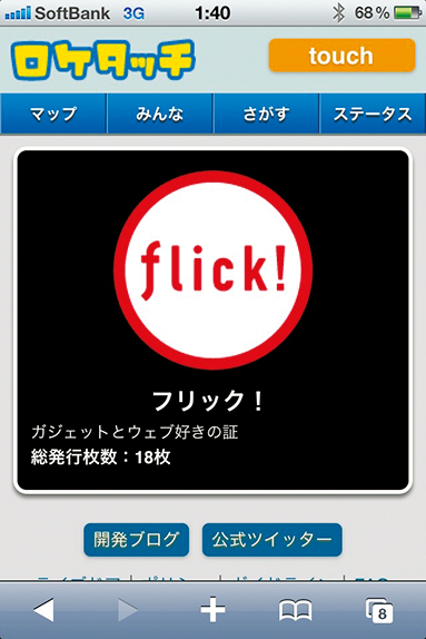 雑誌フリック!創刊時にロケタッチの『フリック!』シールを作ってもらった。位置情報ゲームのルーツかも。