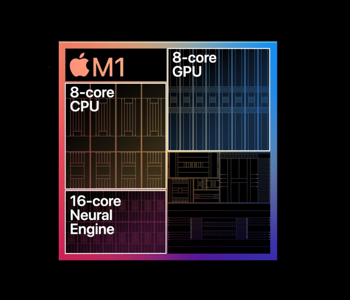 そして、製品版として発売されたM1もA14 Bionicに近い技術を持って作られている。A14 BionicはCPUに2個の高性能コア、4個の高効率コアを搭載し、4個のGPU、16個のニューラルエンジンを搭載しているが、M1はCPUに4個の高性能コア、4個の高効率コアを搭載し、8個のGPU、16個のニューラルエンジンを搭載している。