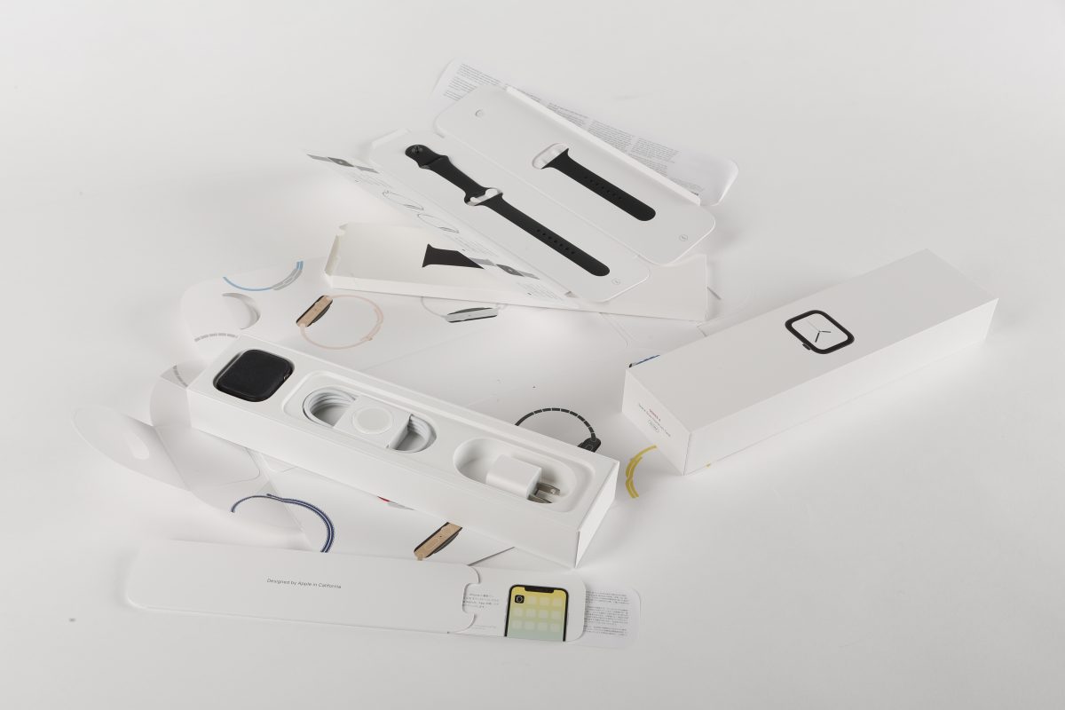 一般的なアルミのApple Watchのパッケージが変わった。ベルトは別売りのものと同じ内容のものがいっしょにパッキングされるようになり、本体は小さなフェルトの入れ物に包まれている。