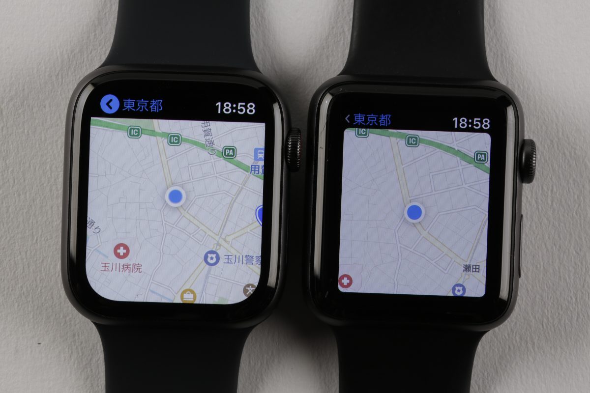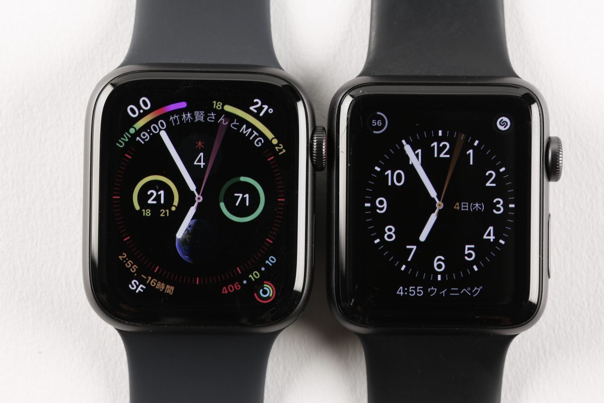 左がSeries 4の44mm、右がSeries 3の42mm。ディスプレイサイズが大きくなった分、より多くの情報を表示できるようになった。大小それぞれベルトは共用。