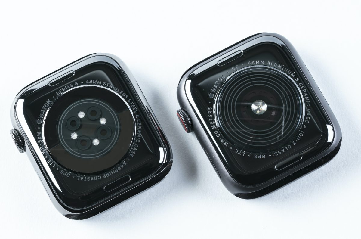 Series 6(左)と、SEの背面。Series 6の背面は放射状にセンサーが配されているが、SEの背面も中央部こそSeries 5と同じだが外縁部は違う。