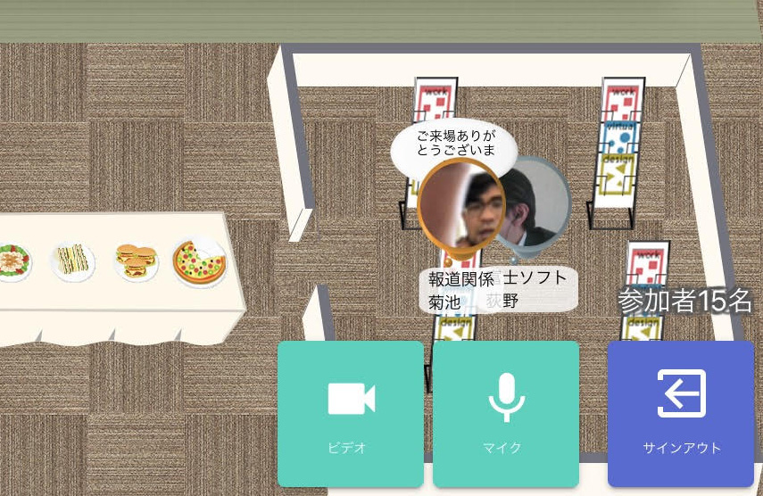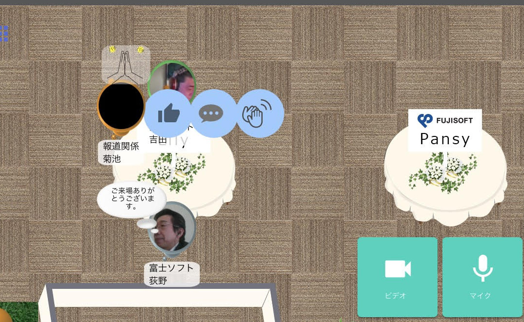 それは、どのようにして行われるかというと、まず準備されたバーチャルオフィスの中に、ほかのオンライン飲み会同様に、アクセスして入っていくことから始まる。本来なら名刺を入り口で提示し、クロークで上着とカバンを預けた感じだろうか。そして、その後はFAM画面内に設けられたテーブル等が配された忘年会さながらの会場に入っていくのだ。