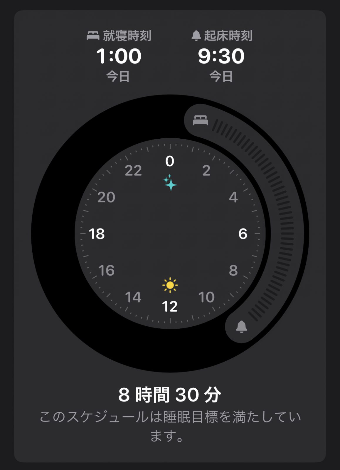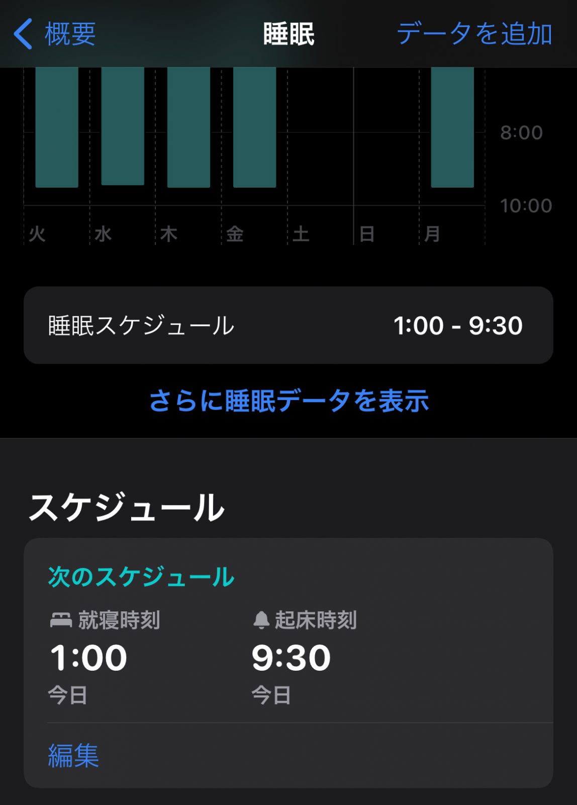 また、寝る時間は『睡眠スケジュール』で管理している。なかなか、設定した時間に寝ることはできないが、Apple Watchを使ってると、だいたい正確に睡眠時間を記録してくれるし、朝には振動で起こしてくれる(ので、家族を起こさなくてすむ)。
