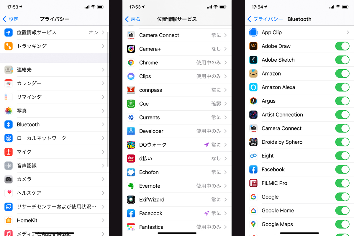 どのアプリが、どのデータを使用するかは、『設定>プライバシー>アプリ名』のところでいつでも確認できるし、個別にオフにすることができる。