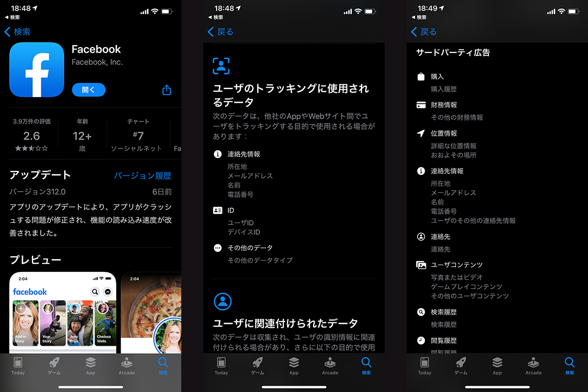 実際、ここにFacebookの説明文を表示しているが、そのデータの多岐に渡ることには、理解していたはずの筆者でもちょっと驚いてしまう。トラッキングには、連絡先所在地や電話番号、デバイスIDなどが含まれているし、ユーザー関連づけられたデータには、広告表示に、購入履歴や財務情報、詳細な位置情報、連絡先情報、写真やビデオ、検索履歴、閲覧履歴、ユーザーIDやデバイスID、スマホの使用状況データまですべてが含まれている。さらにアナリティクスには、健康、フィットネス、機密情報……なども含まれている。