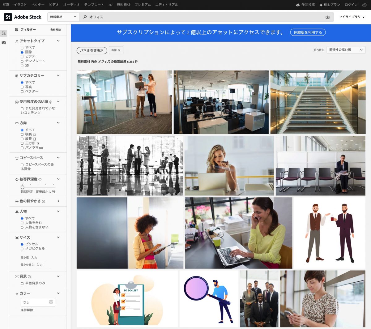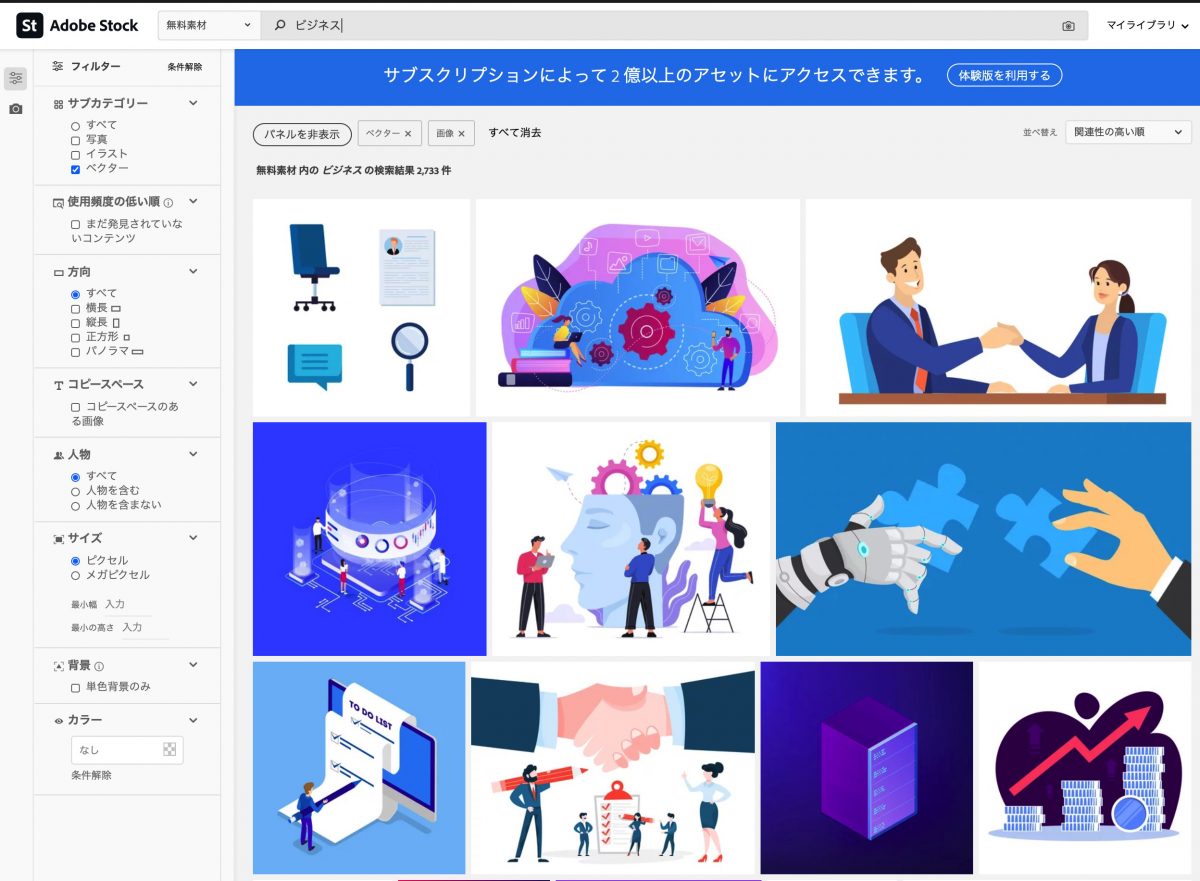 Adobe Stockには約2億5000万枚の素材が公開されており、約6700万枚がイラストや、ベクターデータだ。このうち、約7万8000点が無料素材で、約1万5000点が無料で使えるイラストや、ベクターデータだ。こららはAdobe IDさえあれば、無料で使うことができる。
