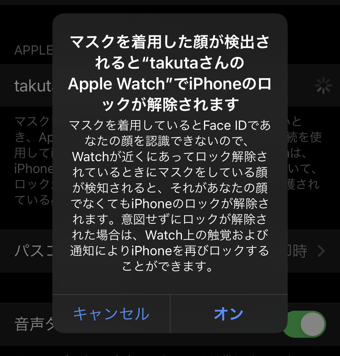 ロックが解除されているApple Watch(Apple Watchは腕から外すとロックがかかるから、解除されているということは本人がしているということになる)が付近にあれば、親機であるiPhoneはマスクをしている顔を認識すれば、ロック解除されるということになっている。