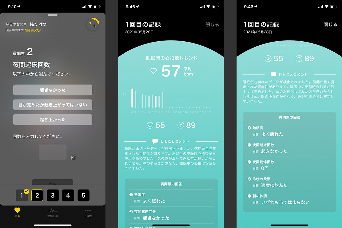 朝、起きるとアンケートに回答するように通知が届き、夜中に起きたか? 動悸を感じたか? 今の気分はどうか? などの5つの質問に答える。これを7夜分行う。