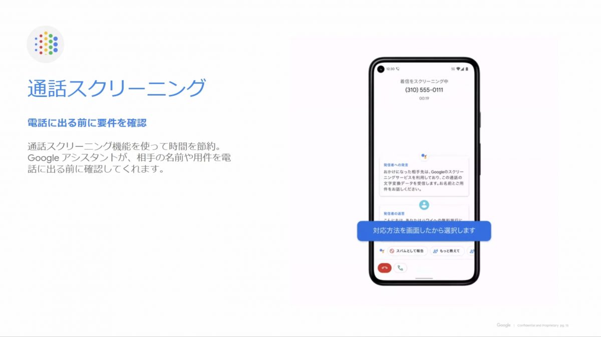 また、通話のスクリーニング機能も搭載。自分が電話に出る前に、Googleアシスタントが、相手の名前や用件を確認してくれるという。あまり余計な電話に出たくない向きには便利な機能だと思われ右る。