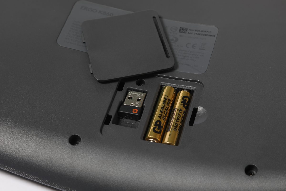 駆動は単4電池2本。「リチウム系の充電式じゃないの?」と思うかもしれないが、この単4電池2本で約2年持つらしから、これで十分とも思える。また、リッドの中にUnifyingのドングルを収納しておくことができる。